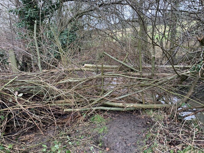 Yet again walkers are crossing from Kestrel Field into Centenary Field despite the dead hedge. As a consequence we've had to extend the dead hedge across to the brook itself. There is no path across from Centenary Field to Kestrel Field and vice versa. Do not break down the dead hedge. That is there for a reason. Kestrel Field is privately owned and there is no Right of Way. Anyone using that field is trespassing.