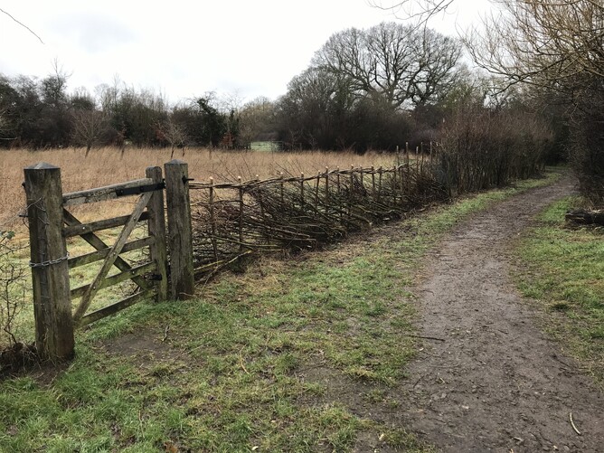 The Rye Meadows volunteers have started to lay the hedge alongside Footpath 24. The hedge was planted some years ago and has now matured enough to lay down. Amongst our team we have an experienced hedge layer and he has been instructing us in the art of hedge laying.